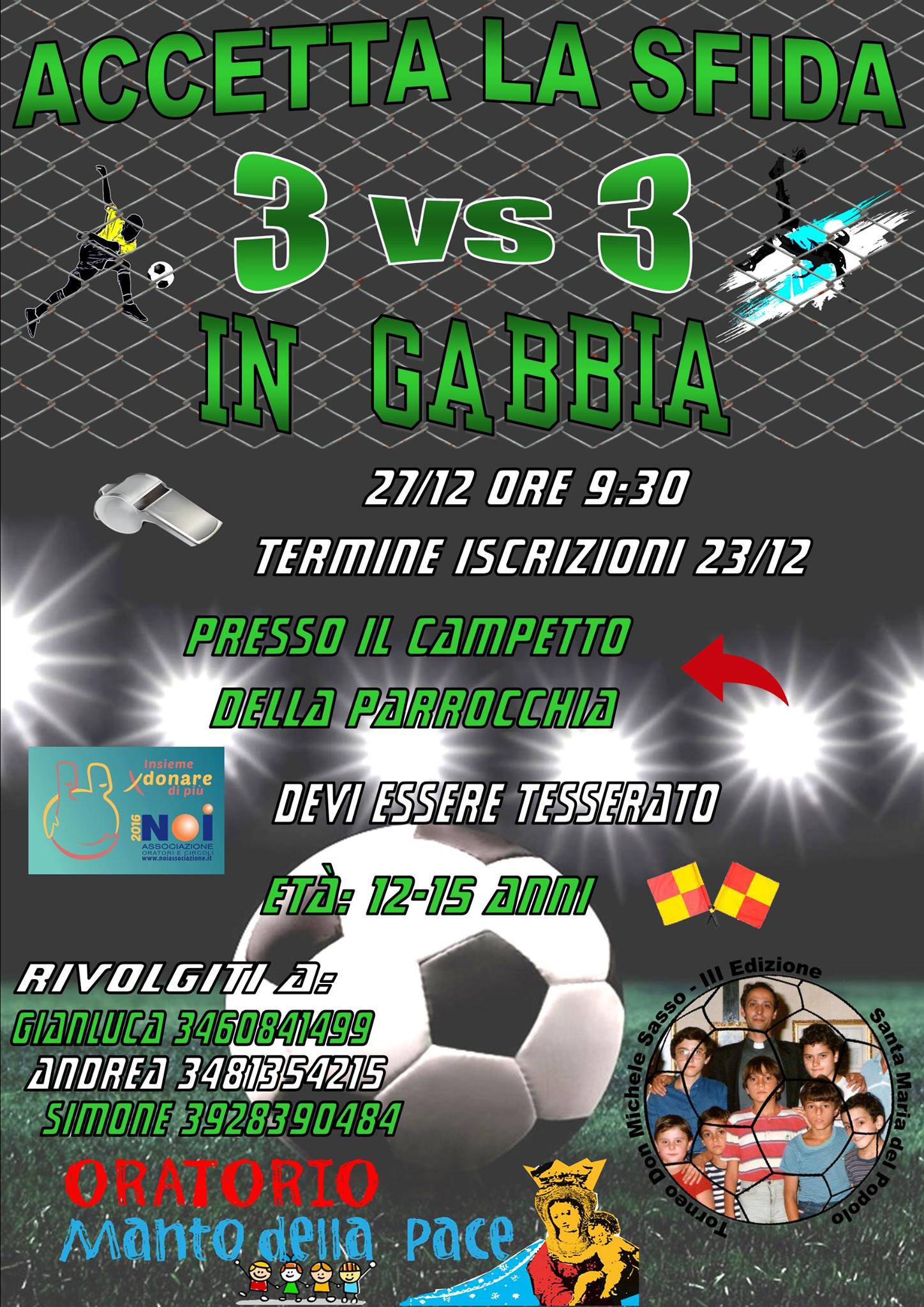 Informazioni utili: - Si terrà il 27/12 ore 9:30 presso il campetto della Parrocchia - Il torneo è rivolto a ragazzi di 12-15 anni compiuti - Il torneo si gioca 3 vs 3 ed è svolto in "Gabbia", ovvero senza "fuori" e bisogna segnare in…